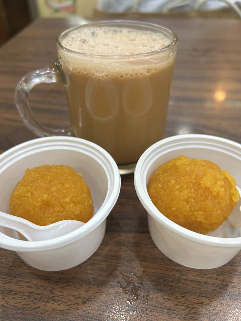 暑くなって来たので休憩しようとクーラーの効いてるレストランに入ってみました。周りがビリヤニを食べている中で、1人だけチャイティーと目についたお菓子を頼んで食べました。