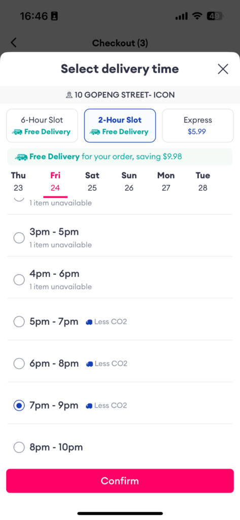 Checkout後に配達日時の指定ができました!6時間毎もしくは2時間毎で無料で指定できます。