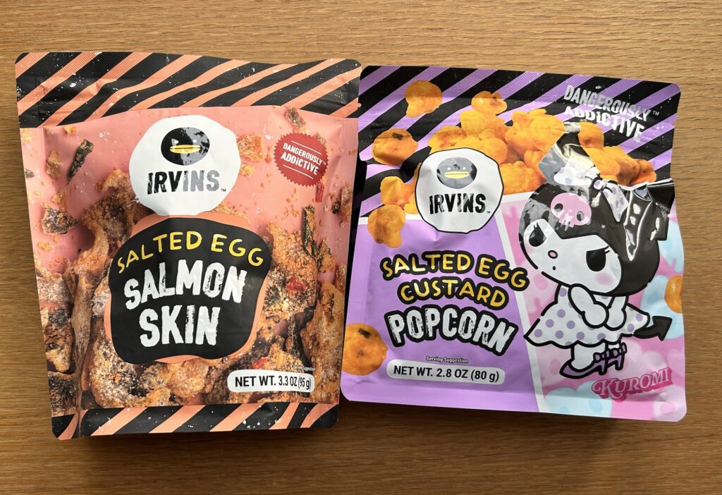 IRVINSの袋麺やフィッシュスキン等のチップス系までなんでも美味しいです。基本的には誰の口にも合います。今回は、新商品のソルテッドエッグカスタードポップコーンという味を買ってみました。試食してみたら案外美味しかったので、親戚の反応を見てみたいと思います。