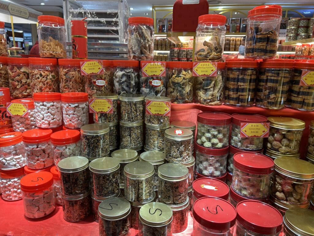 シンガポールの方々は親戚が家に来た時に出すためのお菓子を準備しておくようです。あちらこちらでこのお菓子の出店が並んでいて、手作りのパイナップルタルトやクッキーなどが美味しそうです。
